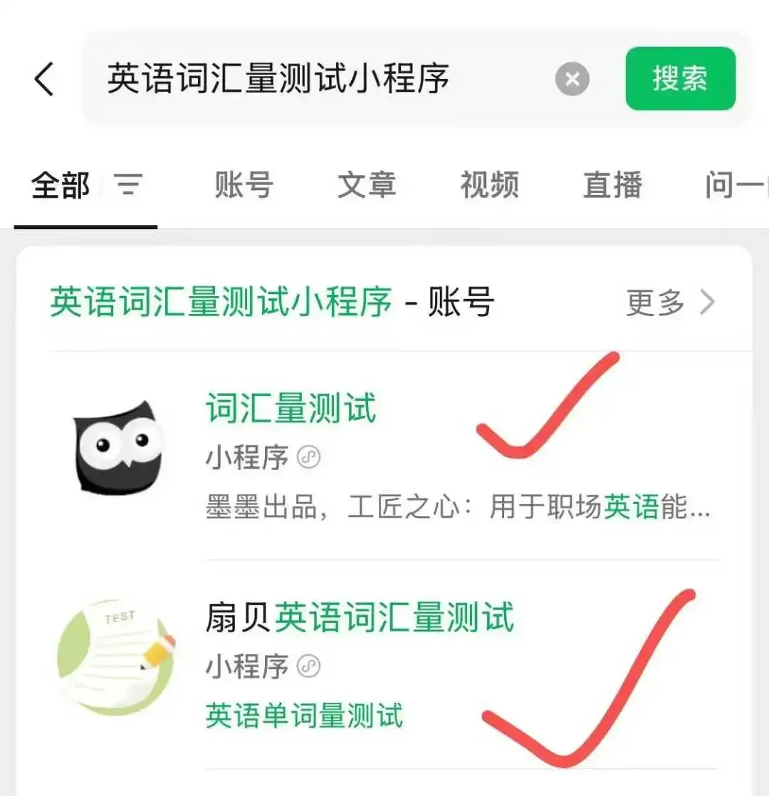 ✨现在就测:打开微信搜索栏,输入「英语词汇量测试」,选择对应词库即刻挑战!