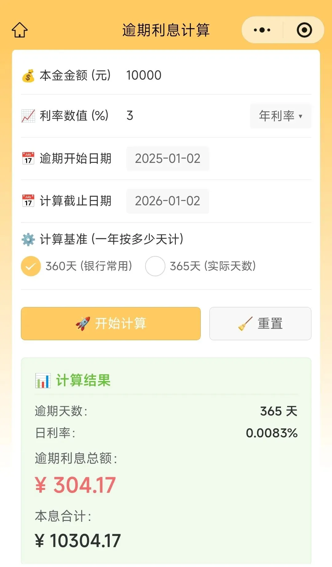 开发了一款微信小程序,用于计算逾期利息。输入本金金额,利率数值(可以选择年利率/月利率/日利率),逾期开始日期,截止日期,自动计算得出逾期天数,日利率,逾期利息总额,本息合计总额。