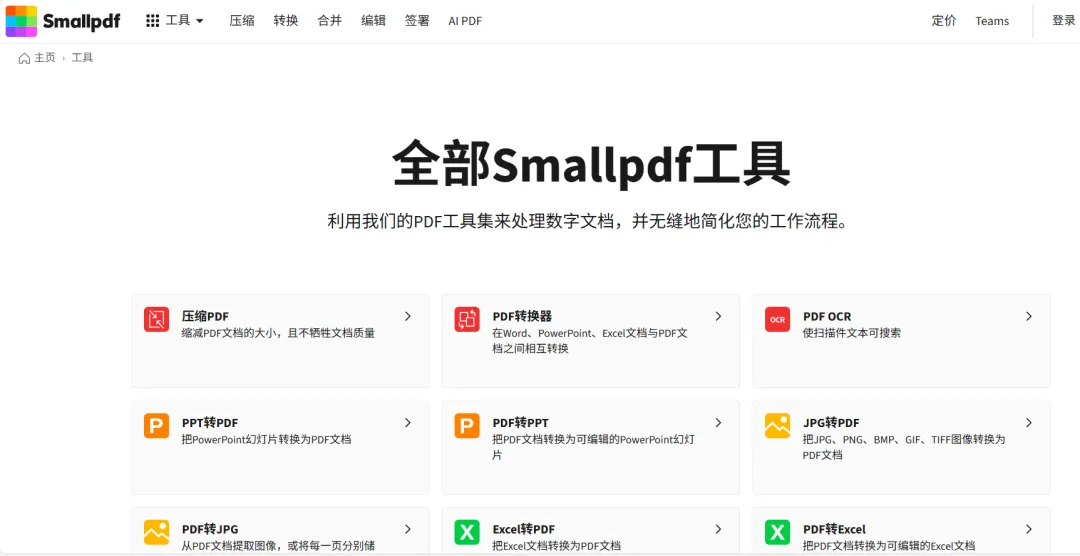 Smallpdf是一个提供一站式PDF处理服务的在线平台,核心功能覆盖PDF转换、压缩、编辑、签名等30余种工具,支持多设备使用,旨在简化数字文档工作流程。