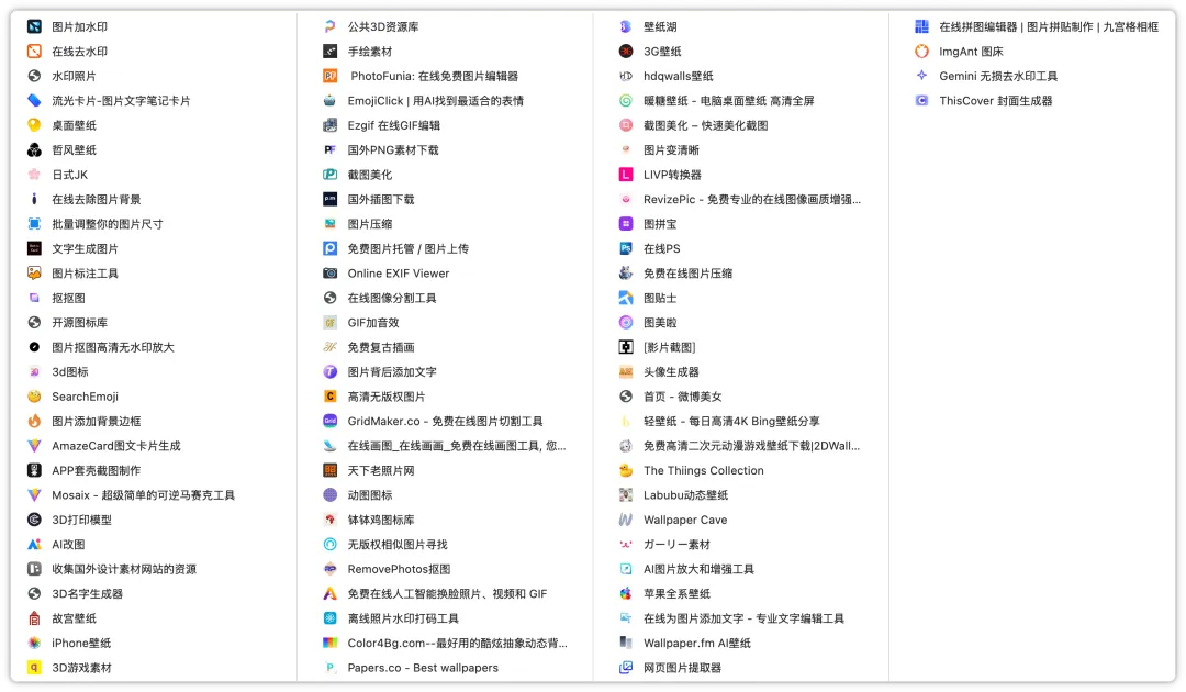 图片工具我主要整理的是这几类。图片头像壁纸网站|图片添加去除水印|图片在线处理工具|图床|图片拼图|各种素材等。