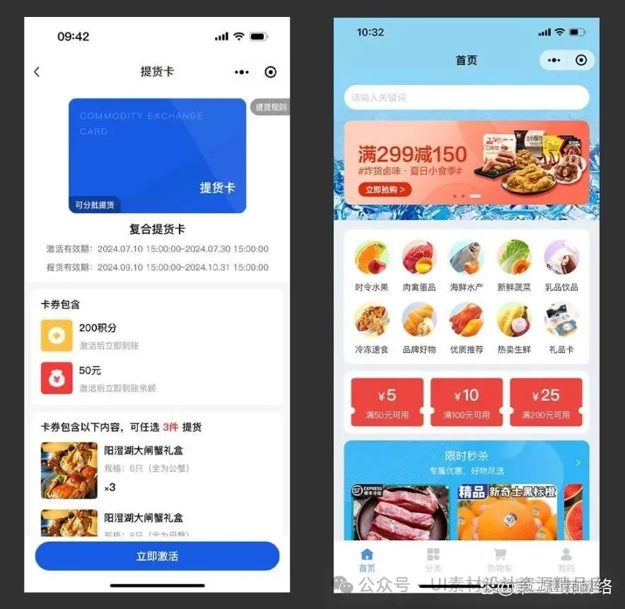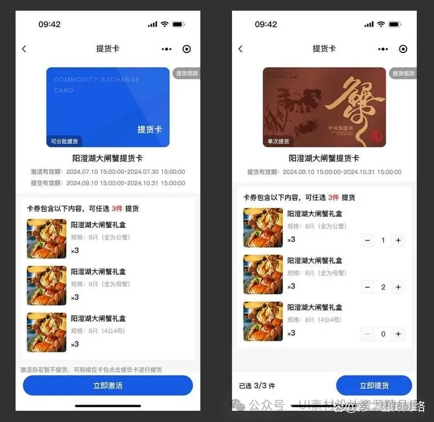 提货卡小程序,可以适用于大闸蟹提货、月饼提货、粽子提货、水果提货、生鲜提货、蔬菜提货等各种各类的实体生鲜商品。同时,为日常节日送礼、企业福利、商场促销、品牌营销等提供一键提货服务。既解决了用户到店等待提货的麻烦,也帮助商家提升了用户的购物新鲜感和满足感。